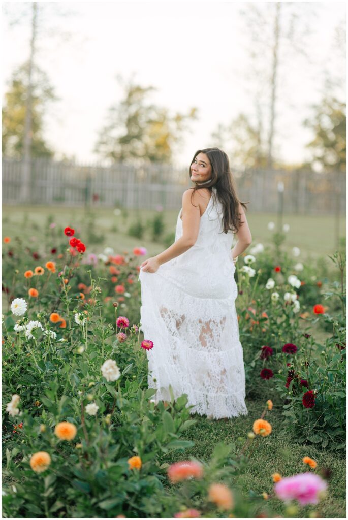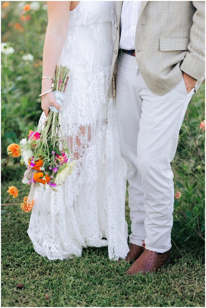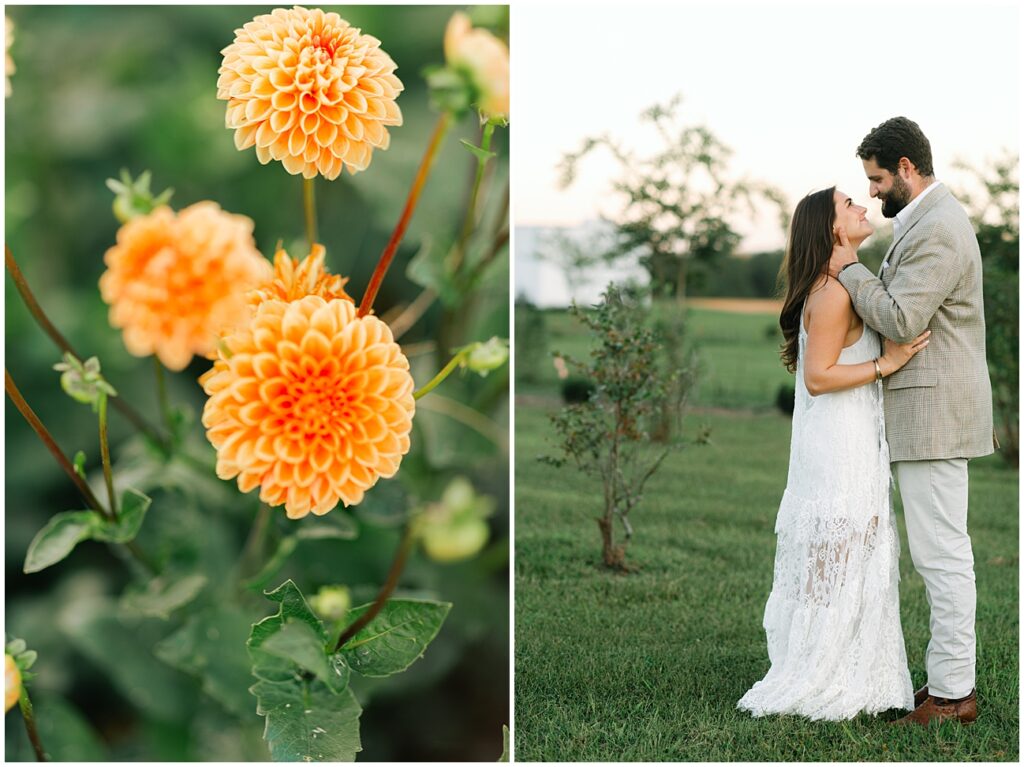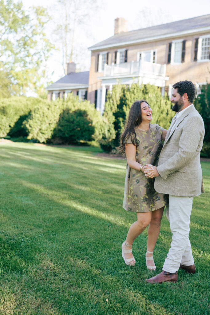 Margaret chose two gorgeous looks for their session. The first was a green and brown floral Staud dress that tied perfectly into their wedding color palette. The second was a lace halter gown from BHLDN—a soft, timeless look that paired beautifully with the venue’s natural elegance.