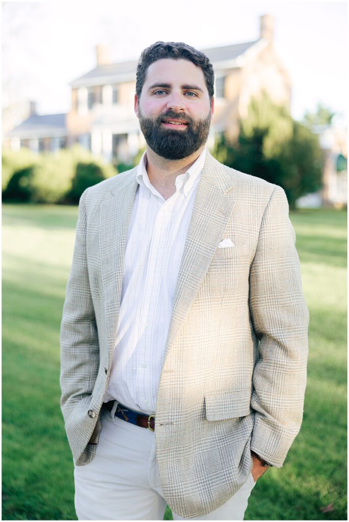 Sam, styled by Margaret’s aunt “Bird,” wore a classic blazer, khakis, Justin boots, and a belt Margaret had gifted him. The combination of textures and tones made their outfits effortlessly cohesive against the backdrop of The Preserve’s rolling hills.
